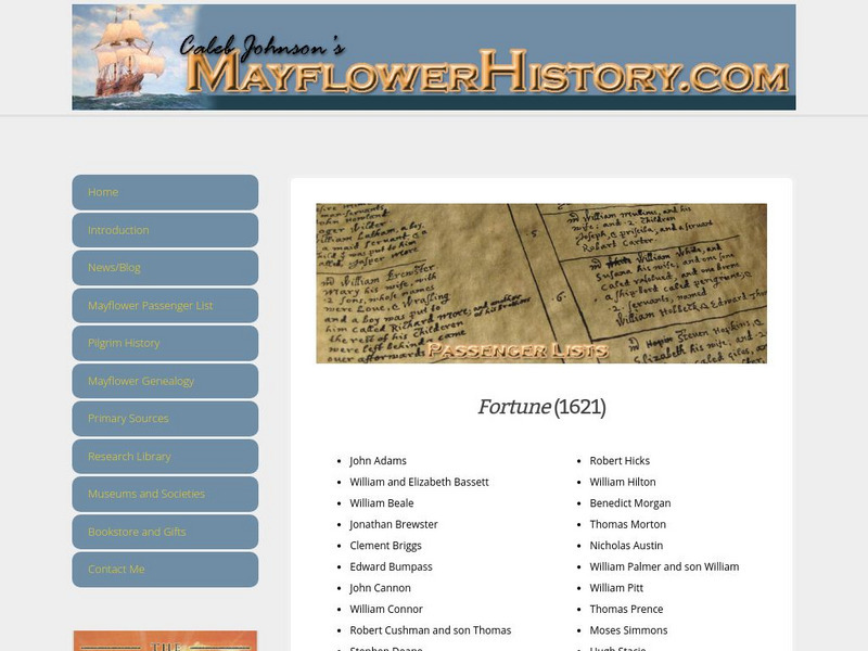 Provides the list of passengers who traveled on the voyage of the Fortune in 1621.