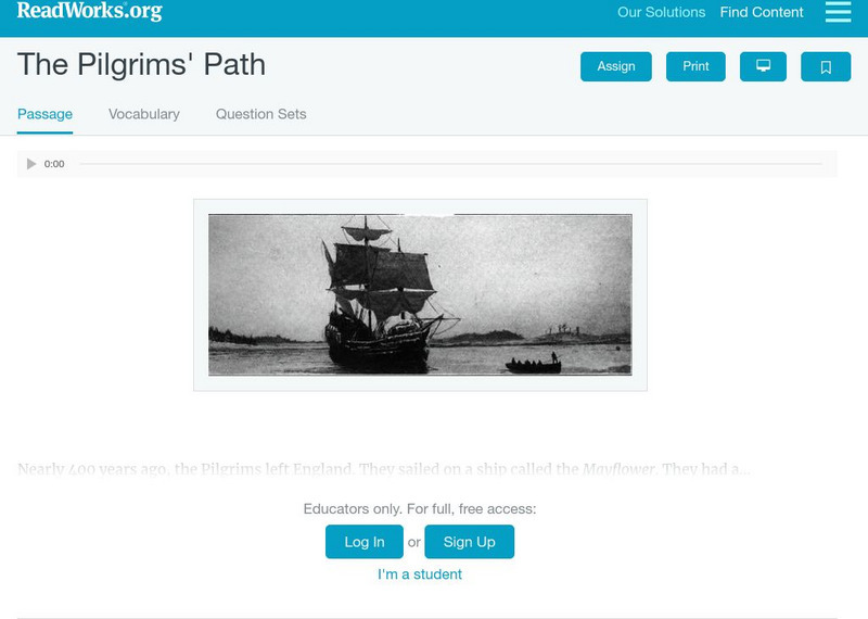 [Free Registration/Login Required] An informational text about the Pilgrims sailing from England to Massachusetts. A question sheet is available to help students build skills in reading comprehension.