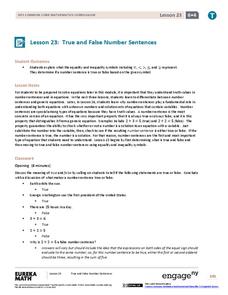 True or false? Scholars determine the truth value of equations and inequalities through substitution. All values to use for substitution are given with each equation or inequality. This is the 24th lesson in a module of 36.