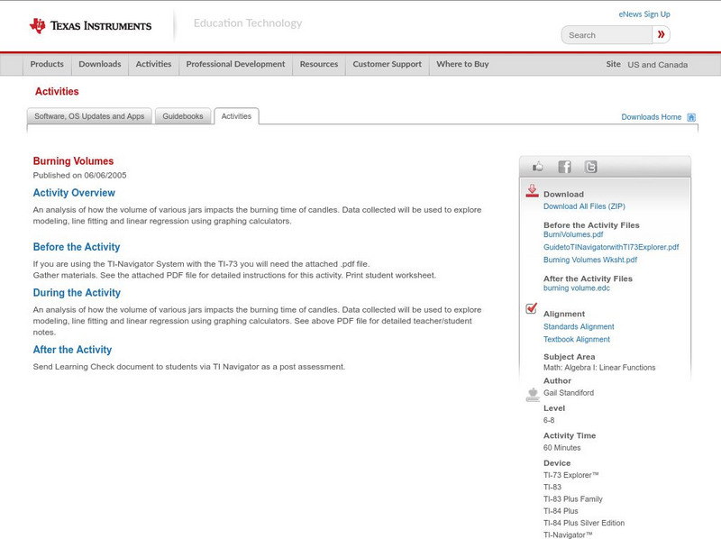 An analysis of how the volume of various jars impacts the burning time of candles. Data collected will be used to explore modeling, line fitting and linear regression Using graphing calculators.