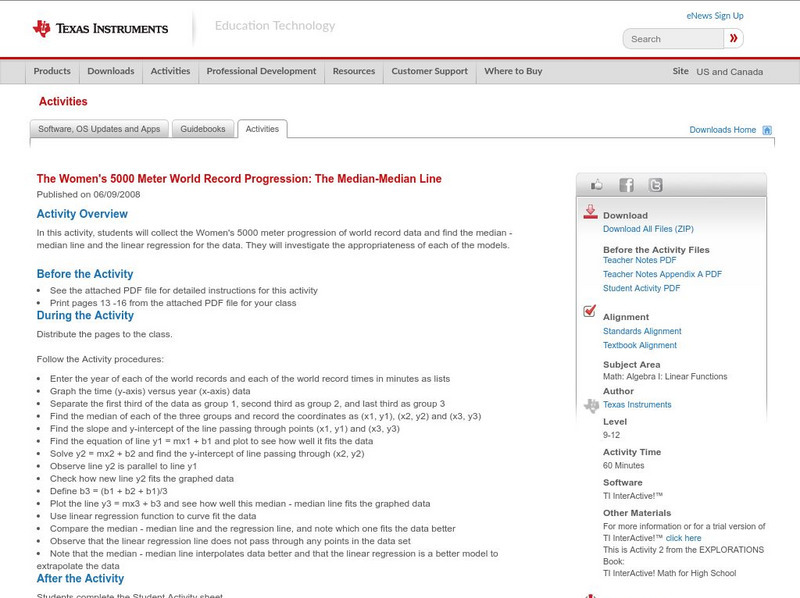 In this activity, students will collect the Women's 5000 meter progression of world record data and find the median - median line and the linear regression for the data. They will investigate the appropriateness of each of the models.