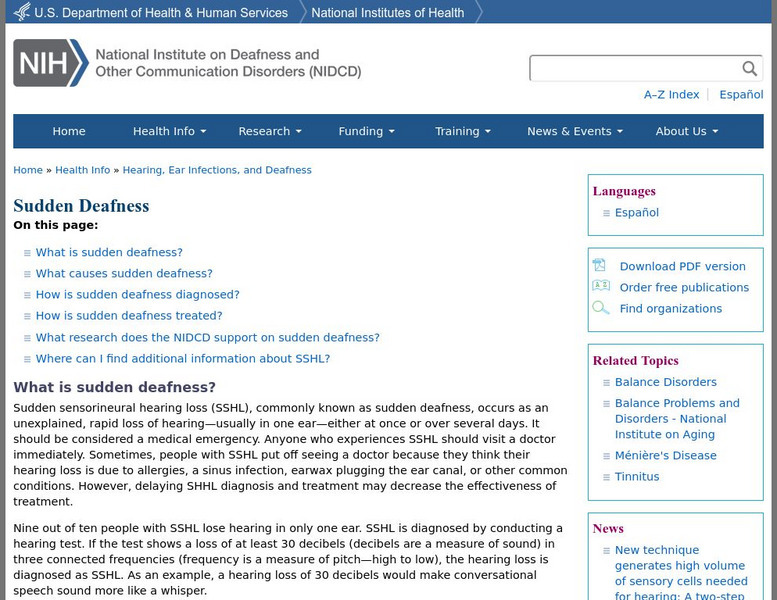 Sudden Deafness, or Sudden Sensorineural Hearing Loss (SSHL), is described at this site. In addition to a description, information is provided on causes, treatment, research, and available resources.