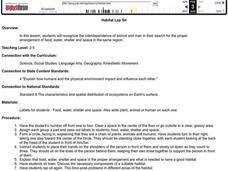 Students examine through role play interdependence of animal and man in their search for the proper arrangement of food, water, shelter and space in the same regions. Students then discuss necessary components of suitable habitat.