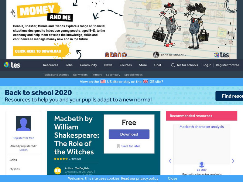 [Free Registration/Login Required] This lesson plan focuses on the role of the witches in Shakespeare's Macbeth including background information about the fear of witches in Shakespeare's time, reading excerpts and answering questions to...