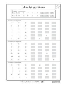 Explore number attributes and skip counting through patterns! Scholars find the pattern in each of these sequences and continue it by writing in the remaining values. They count consistently by various intervals, sometimes forwards and...