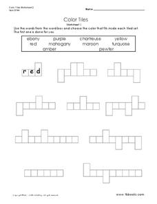 In this word shape worksheet, students use the color word key to help them fit the word inside the tiles. Students spell the words ebony, purple, chartreuse, yellow, red, mahogany, maroon, turquoise, amber, and pewter.