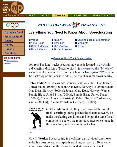 This detailed article includes a history of speed skating, information on rules, different tracks and competitions, and links form more information. A good starting point for students researching this Winter Olympics sport.
