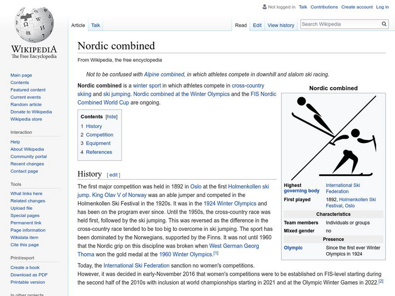 Read about the history, events, and equipment associated with Nordic Combined, a Winter Olympics sport. This brief encyclopedia article is a good introduction to the sport and includes links for more research and detailed information.