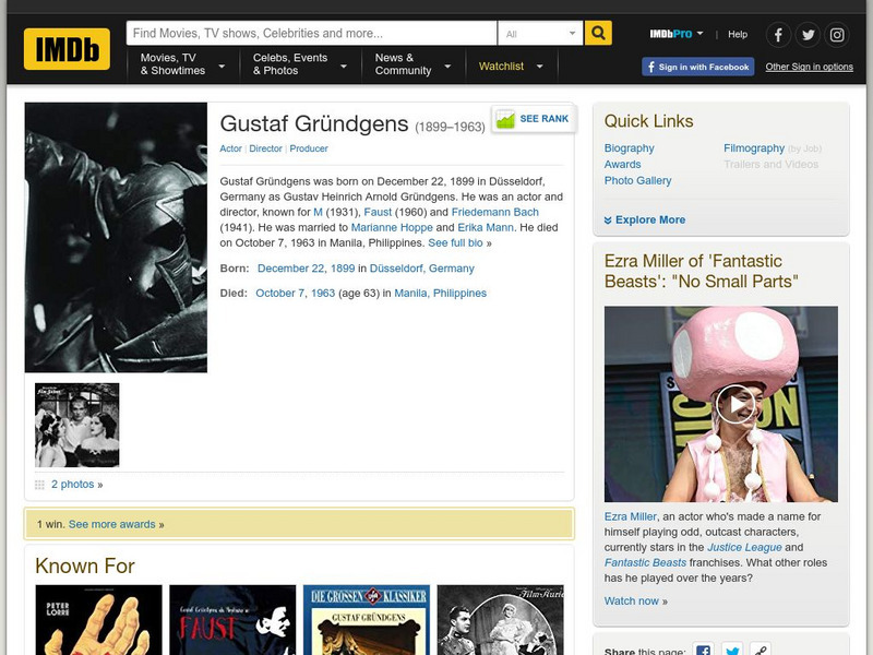 Best known for his role of Mephisto in theatre versions of Goethe's Faust, Grundgens also acted in the murder mystery, "M". Descriptions in English of his acting and directing career.