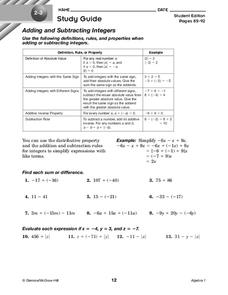 In this integers worksheet, 6th graders solve and complete 42 different problems that include adding and subtracting integers. First, they find the sum or difference of each integer. Then, students evaluate each expression for the given...