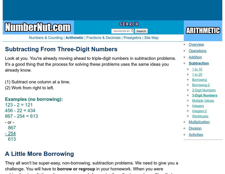 A brief lesson on subtracting from three-digit numbers that includes detailed examples, rules, and further explanation of borrowing.