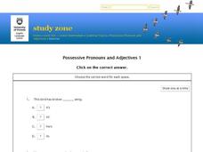 In this online interactive grammar skills learning exercise, learners answer 10 multiple choice questions that require them to select possessive pronouns and adjectives to complete 10 sentences. Students may submit their answers to be...