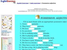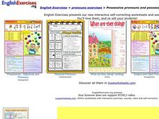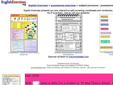 This online, interactive worksheet includes 15 exercises in which quiz takers type in the correct possessive pronoun that corresponds with the preceding simple sentence. This is appropriate for English learners or fourth through sixth...