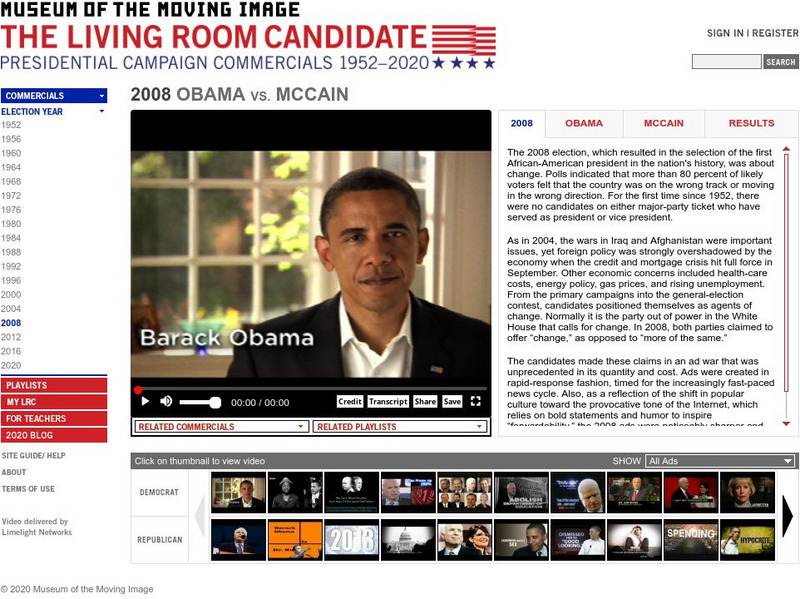 View presidential campaign advertisement from the 2008 election that included the slogans "Change We Can Believe In" and "Country First". Features video clips, information about the candidates, and election results.
