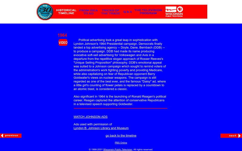 Here, read about and watch some of the famous campaigns ads produced and presented during the 1964 Presidential campaign.