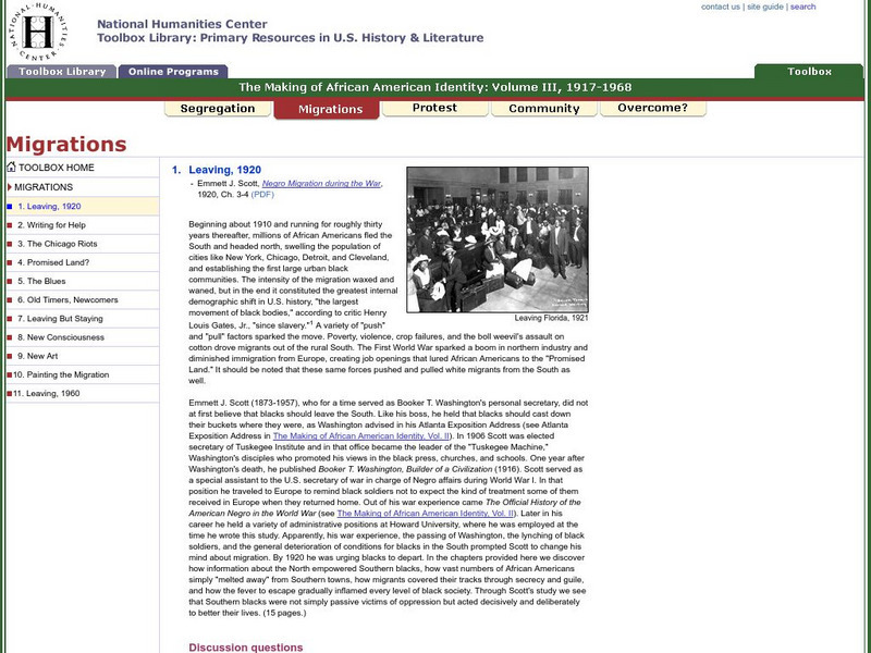 An analysis of the reasons why blacks moved north around the time of World War I. An article by Emmett J. Scott (1873-1957), who for a time served as Booker T. Washington's personal secretary, is linked to this resource.