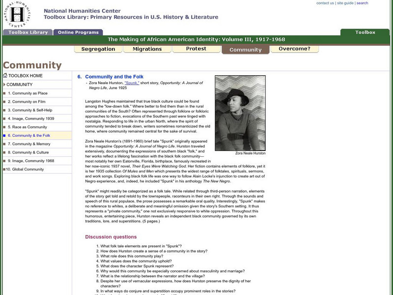 A story that examines African American community in a rural setting. Zora Neale Hurston's (1891-1960) brief tale "Spunk" is provided within this resources and documents the expressions of southern black "folk."