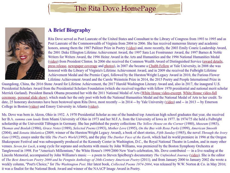 This is the official University of Virginia's Rita Dove Home Page. Read either a brief or a comprehensive biography on Rita poet. This site also offers photographs of Rita Dove and links to other related Rita
