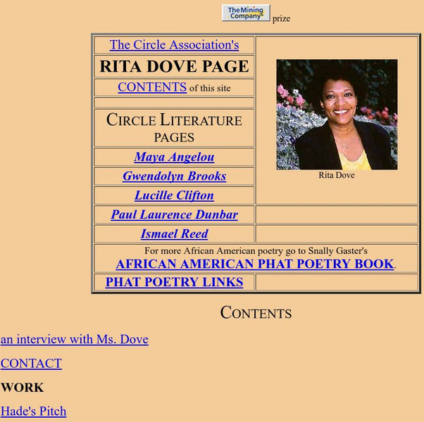 Site from the University at Buffalo is still under construction for a mini biography and bibliography. However, site does have an interview of Rita Dove from 1997 and thirteen writings or poems by Dove. Links to other African American...