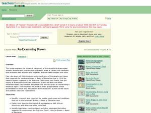 Students identify, research, and report on the people, legal cases and conditions that led to the landmark case, Brown v. Board of Education. They role-play various people from the era preceding 1954.