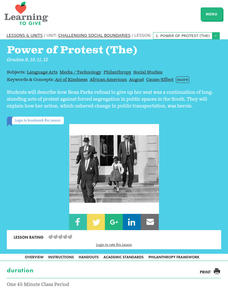 Students recognize the power of protest. In this civil rights lesson, students consider the success of Rosa Parks and her protest that sparked the movement. Students study the Montgomery Bus Boycott in depth and reflect on Parks's...
