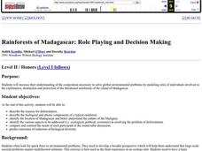 High schoolers examine reasons for deforestation and become familiar with Madagascar and its culture, while describing biological and abiotic components of a rainforest, and looking at aspects that must be addressed to resolve the issue...