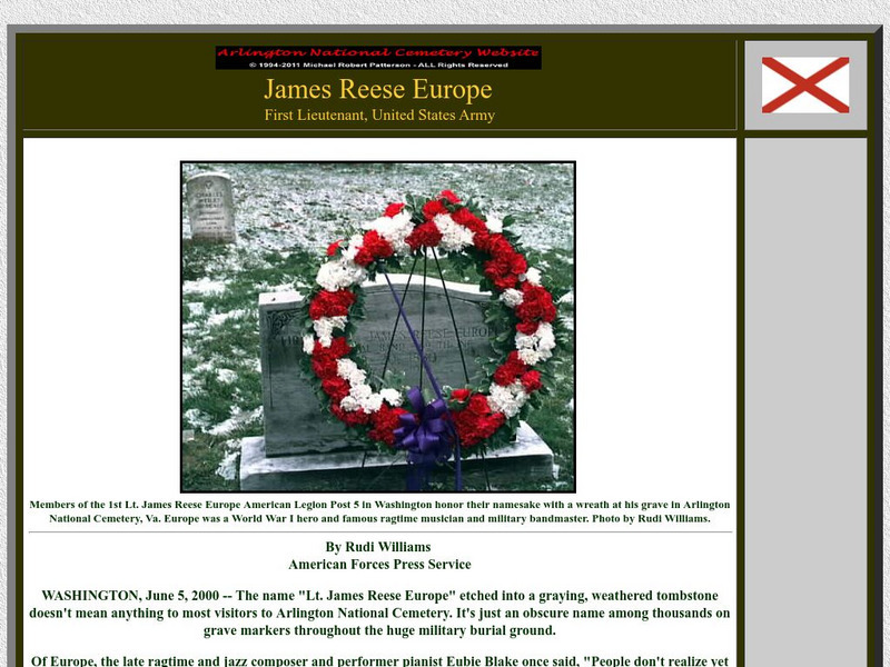This unofficial site about those interred in Arlington National Cemetery offers a brief biography of James Reese Europe, African American jazz musician who was the leader of the military band attached to the 369th Infantry Regiment, the...