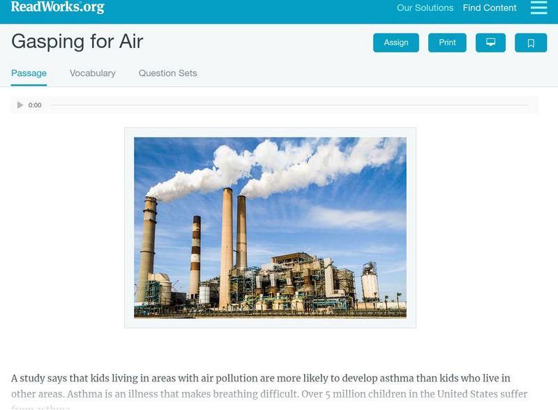 [Free Registration/Login Required] An informational text about the increased risk of asthma for children living in areas with air pollution. A question sheet is available to help students build skills in reading comprehension.