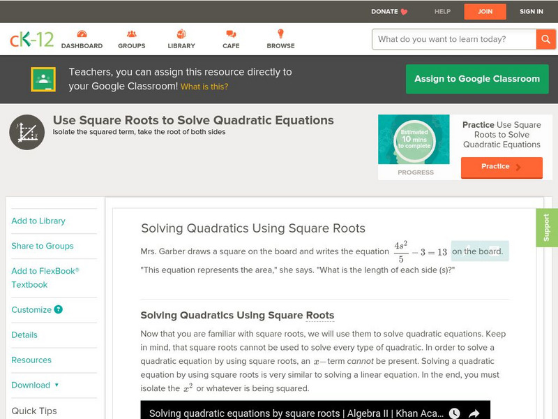 Ck 12: Algebra: Use Square Roots to Solve Quadratic Equations