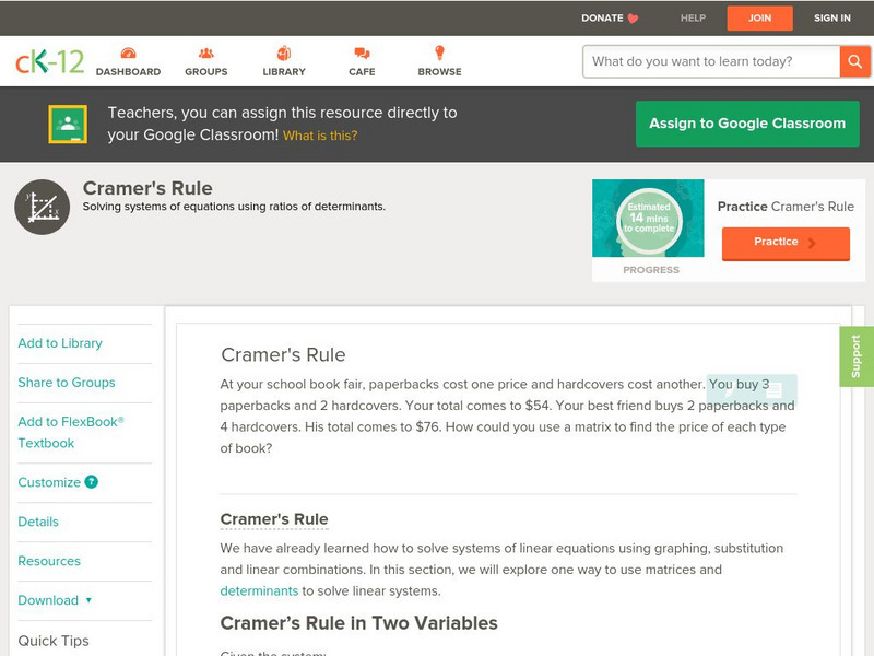 [Free Registration/Login may be required to access all resource tools.] This lesson covers solving systems of equations using Cramer's Rule.