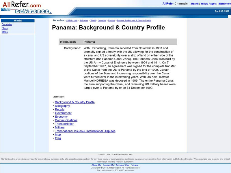 Good resource for studying about the Central American country of Panama. Learn significant facts about its geography, culture, economy, government, and more. You can even view a map and a flag.