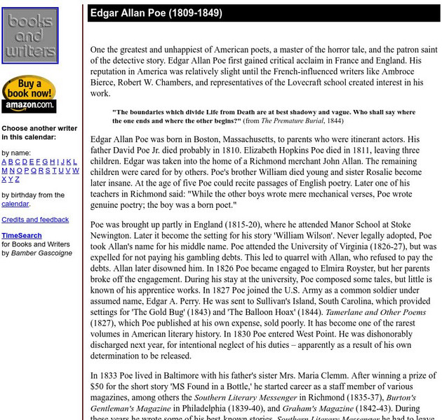 Provides a biography of Edgar Allan Poe, one of "the greatest and unhappiest of American poets, master of the horror tale, patron saint to the practitioners of the detective story."
