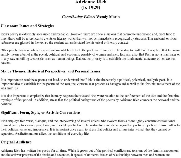 This site offers a lesson plan to use when teaching the writings of Adrienne Rich.