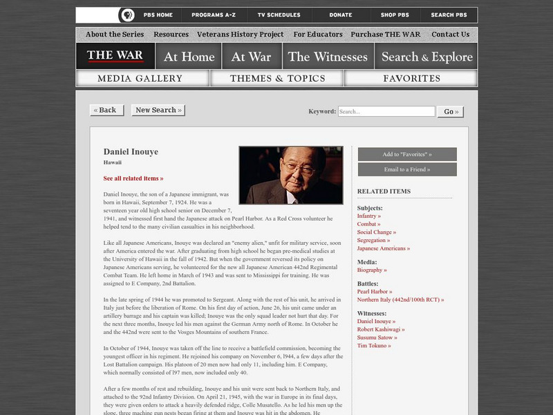At the online companion site of the PBS documentary series "THE WAR," read the biography of a Japanese American soldier, Daniel Inouye, who served during WWII, and became a U.S. Senator from Hawaii. With links to related resources,...