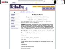 Fourth graders use movie ticket prices and zoo admission prices to practice multiplying money amounts. In this money multiplication lesson, 4th graders use the Internet to find admission prices for amusement prices and movies. Students...