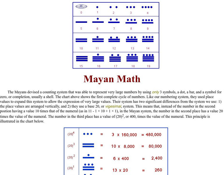 A basic, illustrated description of the math system developed by the Mayans. Includes a paragraph comparing the Mayan system favorably with the Roman numeral system of the same time.