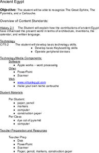 Students use the internet to gather information on Ancient Egypt. Using this information, they create their own name cartouche using markers and construction paper. They also make pyramid cutouts and draw pictures of the Great Sphinx.