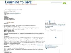 Learners use the internet to research topics on Ancient Egypt. They practice using new vocabulary and identify the types of food they ate and clothing they wore. They explain the role of the Nile as well.