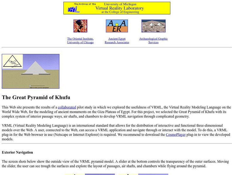 This site is a "modeling of the Great Pyramid of Khufu". The method used is "Virtual Reality Modeling Language" or "VRML". Every angle on the exterior and interior is displayed in great detail and with diagrams.