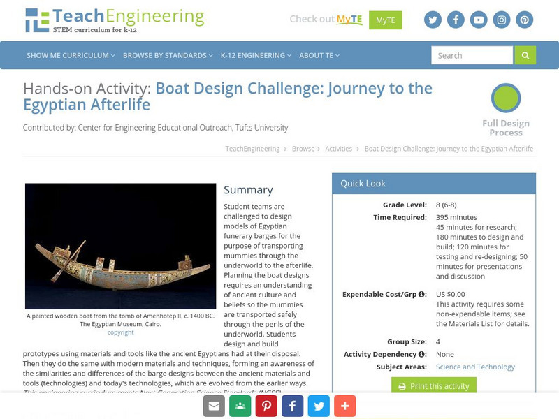 Students work together to design an Egyptian funerary barge. They discover the importance of the afterlife to Egyptians. They create their boat and share their design with the class. They compare and contrast the technology of Ancient...
