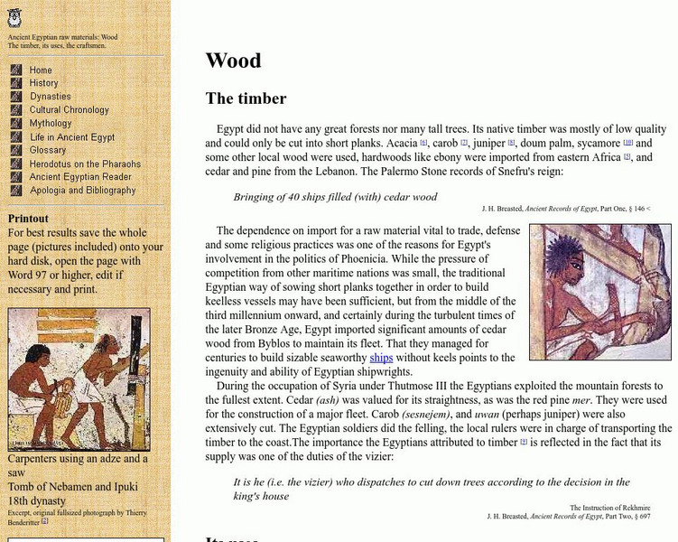 The Egyptians used wood for many things, but had very little locally, so you can see that they needed to trade for it. Read about how the carpenters used the wood they acquired. Hyperlinks to other places in website. Links to other...