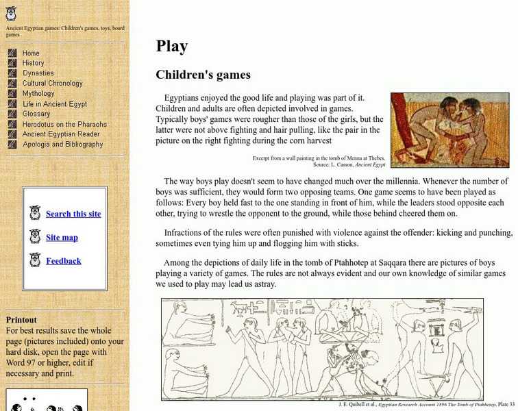 A comprehensive look at children's and adults' games and recreation with explanations of the games and pictures of children at play found at Saqqara. Lots of other pictures too. Many links to other websites.