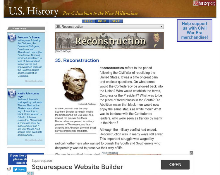This site provides an article about President Andrew Johnson. The article is three pages in length providing a picture along with factual information about the President. A timeline is also provided at the top of the page.