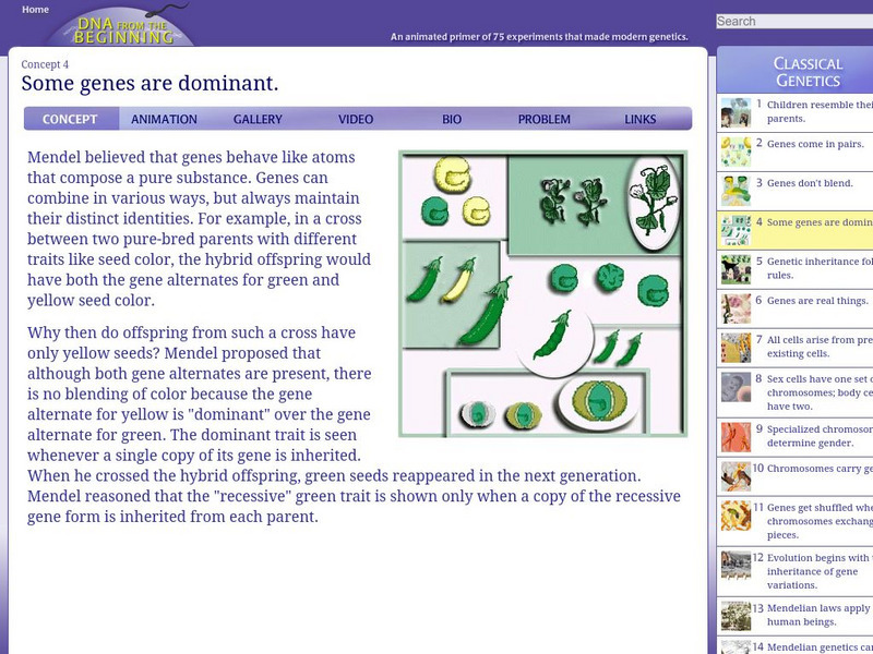 At DNA from the Beginning, choose from classical genetics, molecules of genetics, genetic organization and control. Each concept is explained through animation, an image gallery, video interviews, biographies and links.