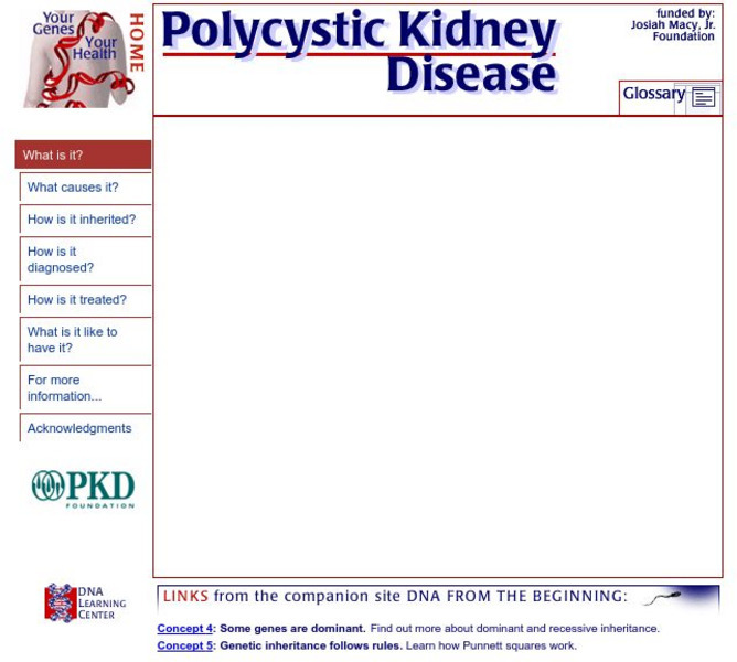 There is plenty of general information about Polycystic Kidney Disease at this interactive site. You can find videos, interviews, animations, and explanations about many topics including: treatment, causes, testing, incidence, and symptoms.