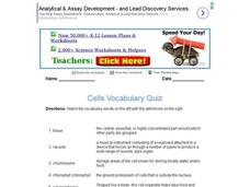 In this cells vocabulary worksheet, students draw lines to match 12 words pertaining to cells to their meanings. Prior knowledge is assumed.