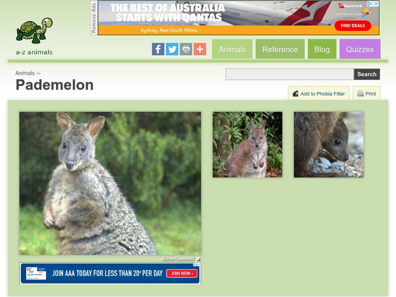 Provides photographs and a fact card about the pademelon, an Australian marsupial. Discusses the different species, lifestyle, habitat, diet, predators, reproduction and development.