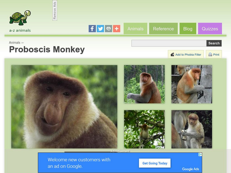 Provides photographs and a fact card about the proboscis monkey. Discusses their classification and evolution, physical appearance, distribution and habitat, behavior and lifestyle, life cycle, diet, predators, interesting facts, threats...