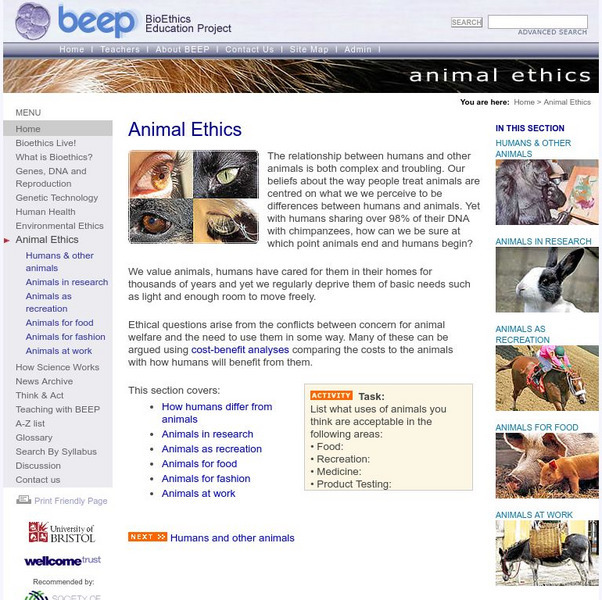 The tutorial examines animal ethics. Topics explored are animals in research, animals as recreation, animals as food, and animals at work. The resource consists of articles, questions, additional resources, and activities.