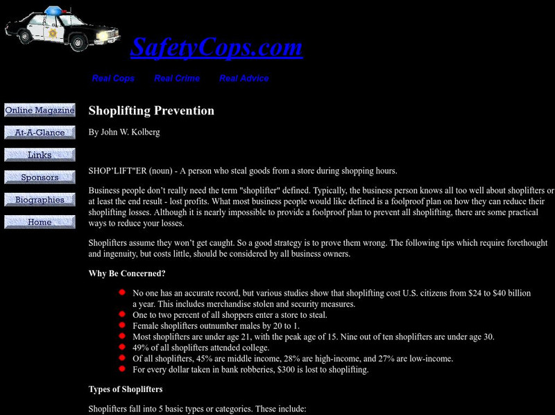 This site from Crime Doctor describes shoplifting, how it occurs, and security measures retail store operators can take to reduce it. Additional links to related shoplifting topics are included.
